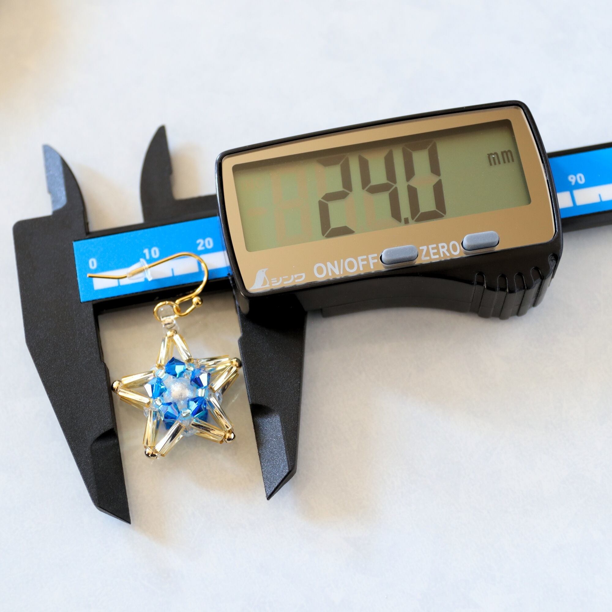 厳選した7種類のビーズを編み合わせて揺れるたびキラッと光る五芒星の耳飾りを作りました。